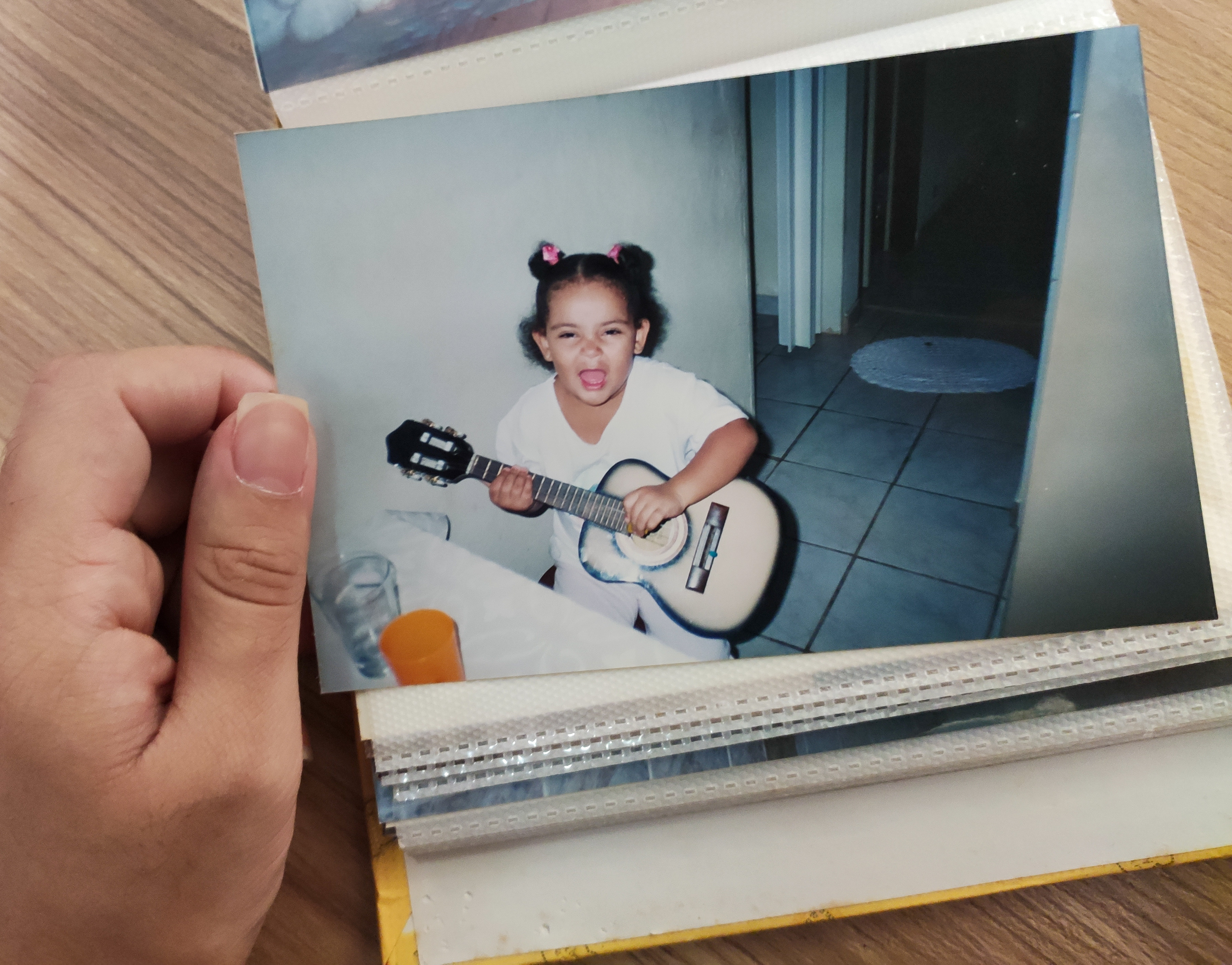 Não sei com quantos anos, nem em que situação essa foto foi tirada, mas ela é fofa então eu quis compartilhar. Esse era o cavaquinho que meu primo tinha. E, provavelmente, eu estava tentando tocar e cantar (coitado de quem estava perto).
