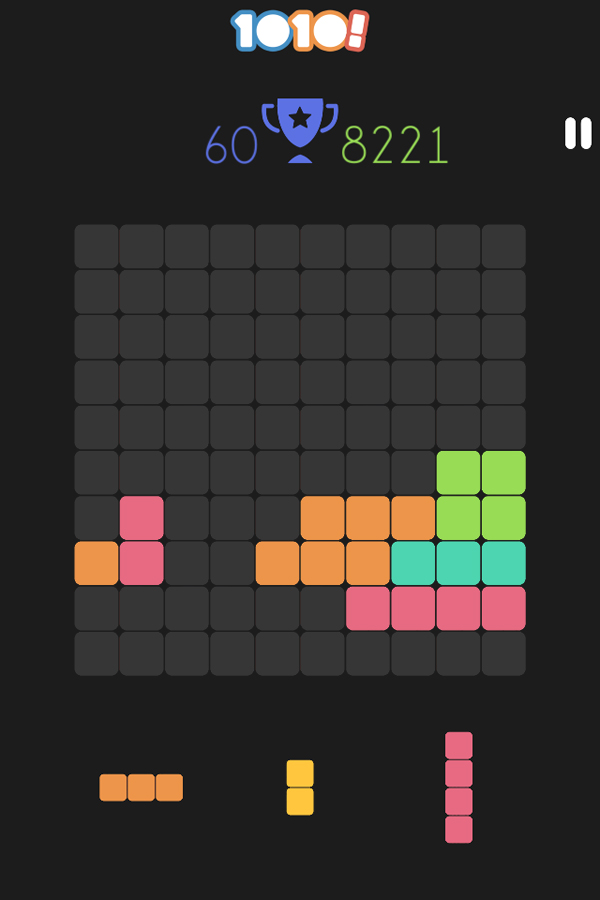 1010! é um jogo que eu sempre tive, independente do celular. Ele é uma ótima distração para passar o tempo e pode ser jogado offline. Nele, aparecem três sequências de quadradinhos coloridos embaixo e você precisa colocá-las no quadrado grande, encaixando-as. Conforme você completa uma linha ou coluna, ela some, te dando mais espaço para encaixar os novos quadrados. Se o espaço acabar, você perde.