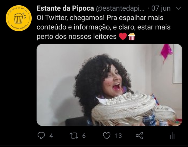 Fazia um tempão que eu queria levar o Estante da Pipoca pro Twitter, afinal é a minha rede social favorita. Eis que finalmente aconteceu! Somos @estantedapipoca por lá.