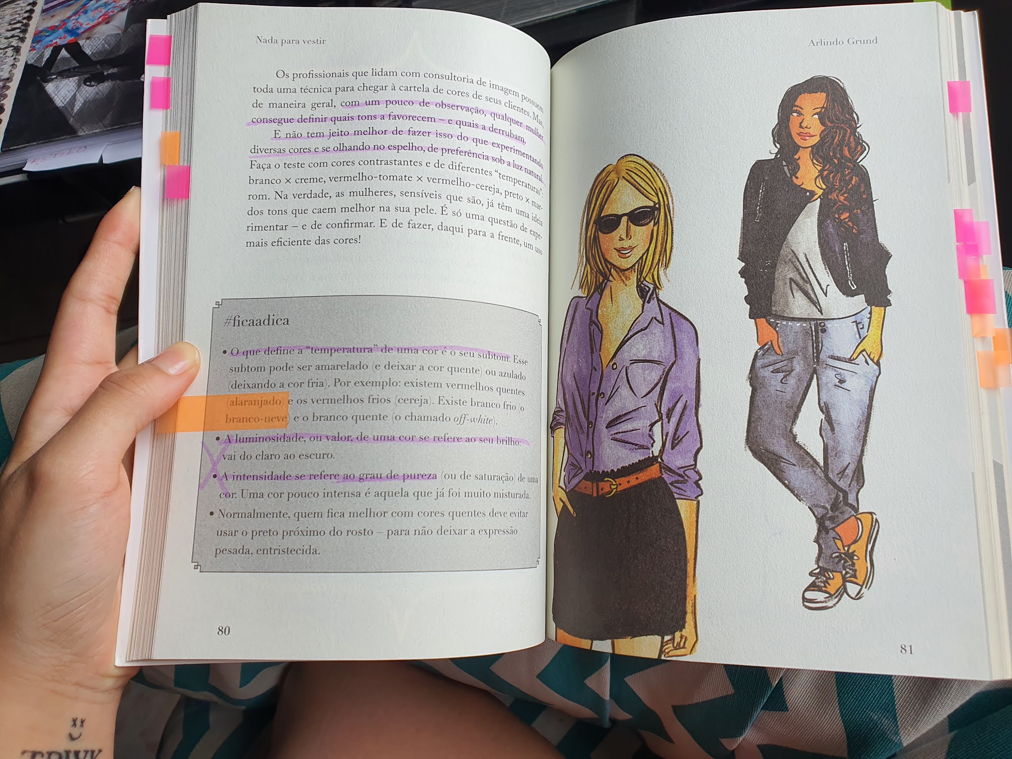 É dividido em 4 partes: “Você pessoa física”, “Você pessoa jurídica”, “Você e as suas formas”, e “E tem mais…”. As duas primeiras partes, são basicamente uma lista de “peças para ter”, os básicos explicados com dicas para você escolher os seus, e ele fala de roupas, bolsas e sapatos.. Minhas duas únicas observações para a primeira parte são: os quotes “sabotadores de imagem” que ele coloca ao final do primeiro capítulo, que eu, Thaís, não concordo 100% com os da Costanza (rosa-bebê, dependendo de onde e como for usado não é coisa de criancinha) e Gloria Kalil (dá para misturar roupas esportivas com passeio, depende do seu estilo), e na parte que ele fala das cores (e sim, ele fala muito brevemente sobre coloração pessoal no livro), tem uma informação errada, luminosidade é se a cor é clara ou escura e não brilhante ou opaca, isso é intensidade.