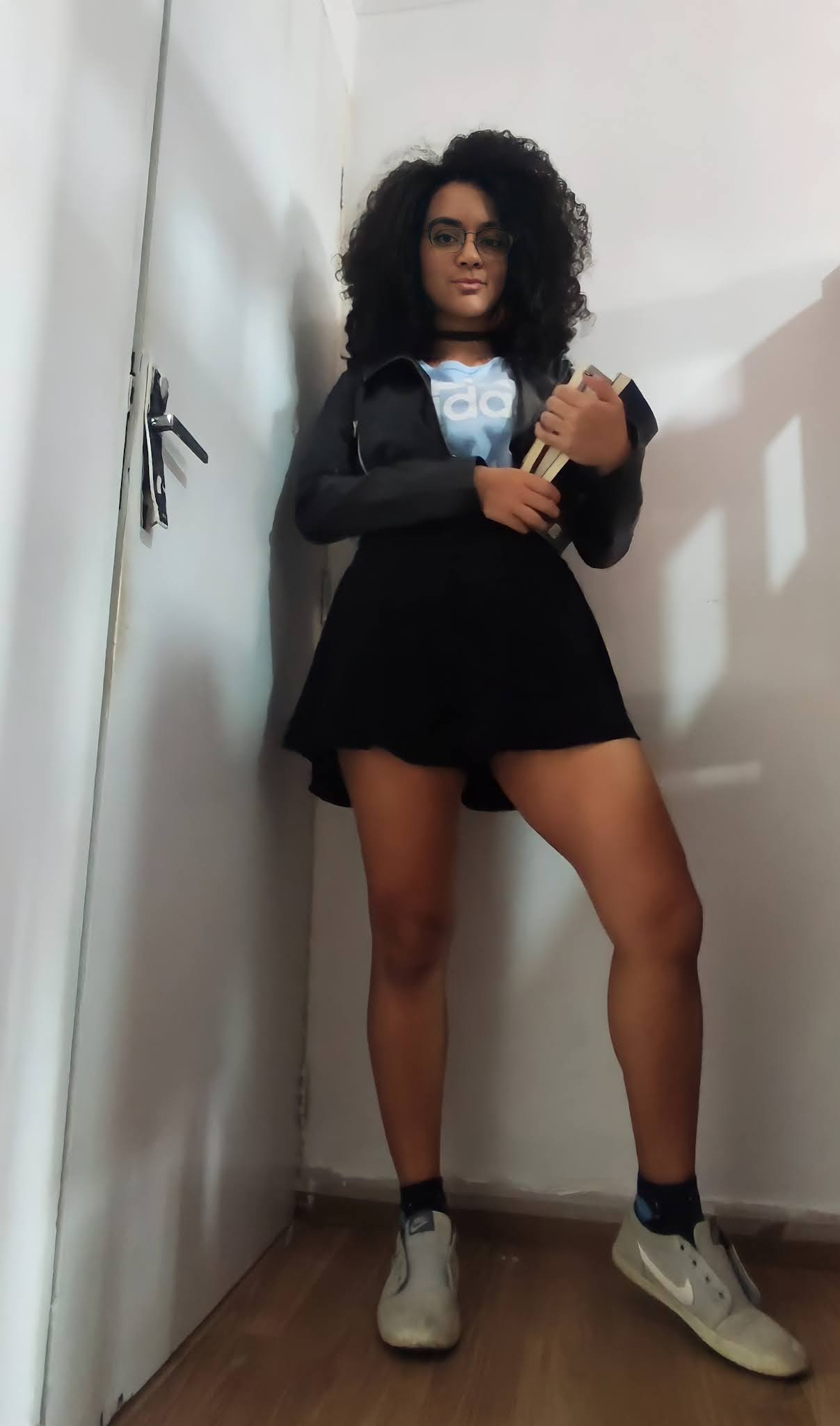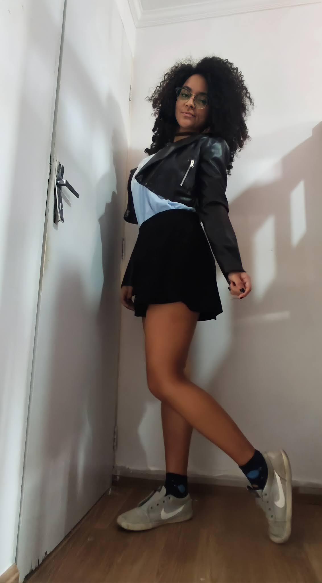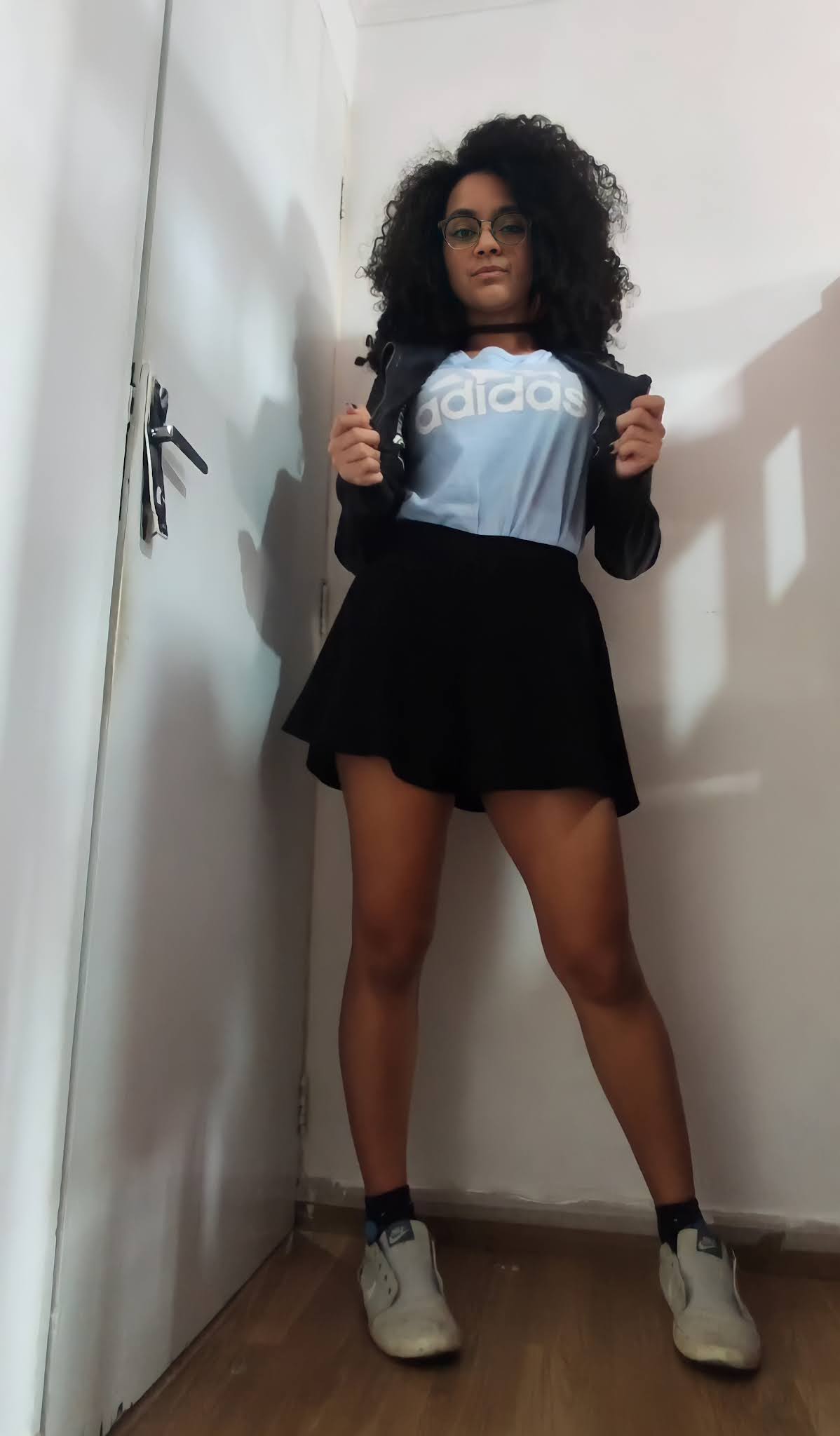 Criei um look sobrepondo uma blusa de frio por cima de uma camisa branca, e usei short jeans, já que não tenho calça. O óculos redondo é um ponto que já temos em comum.