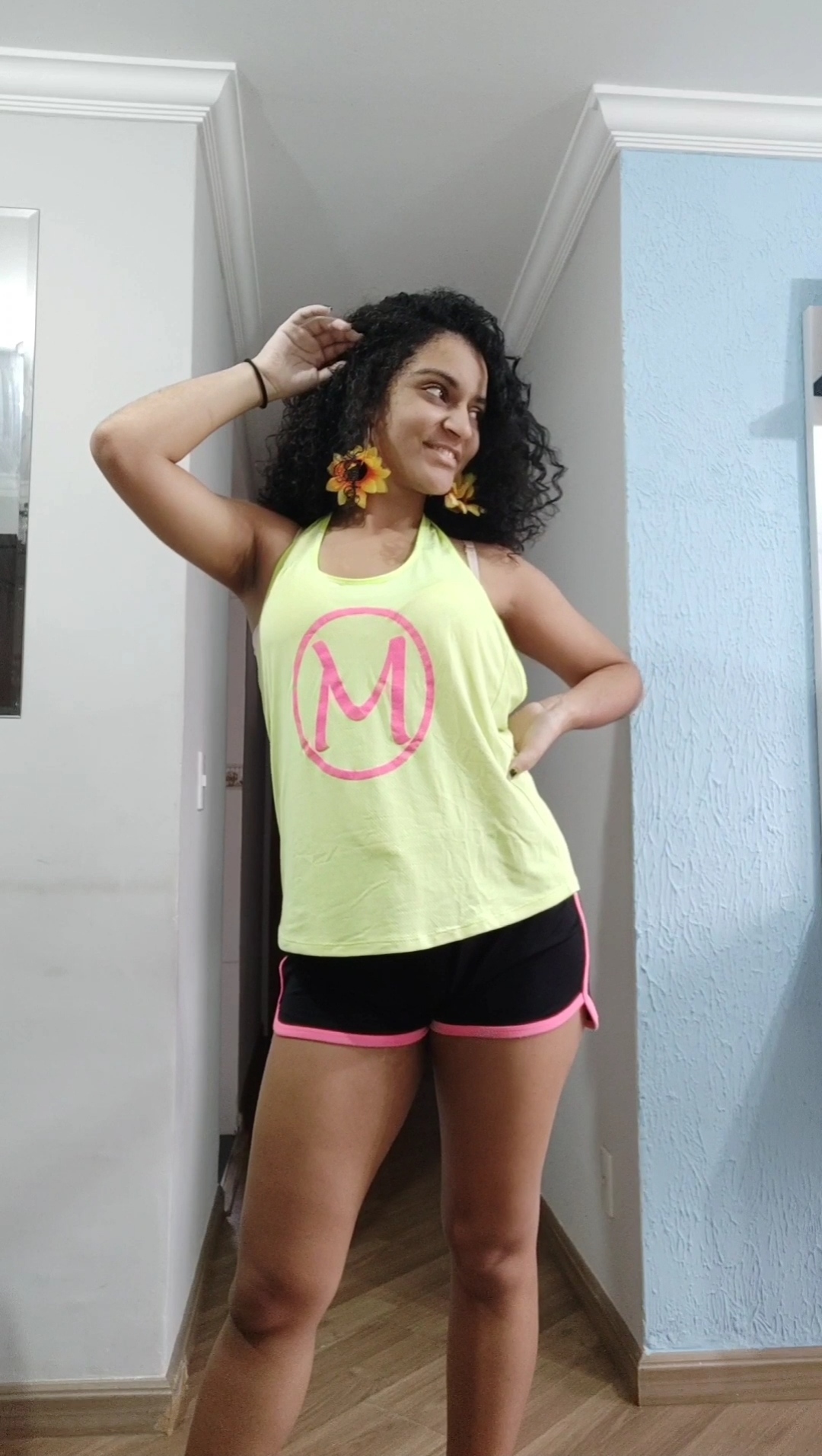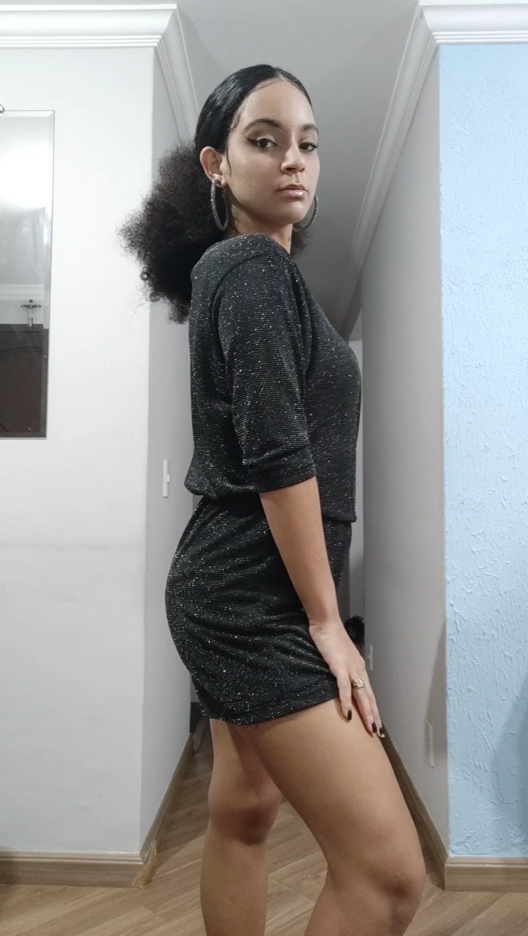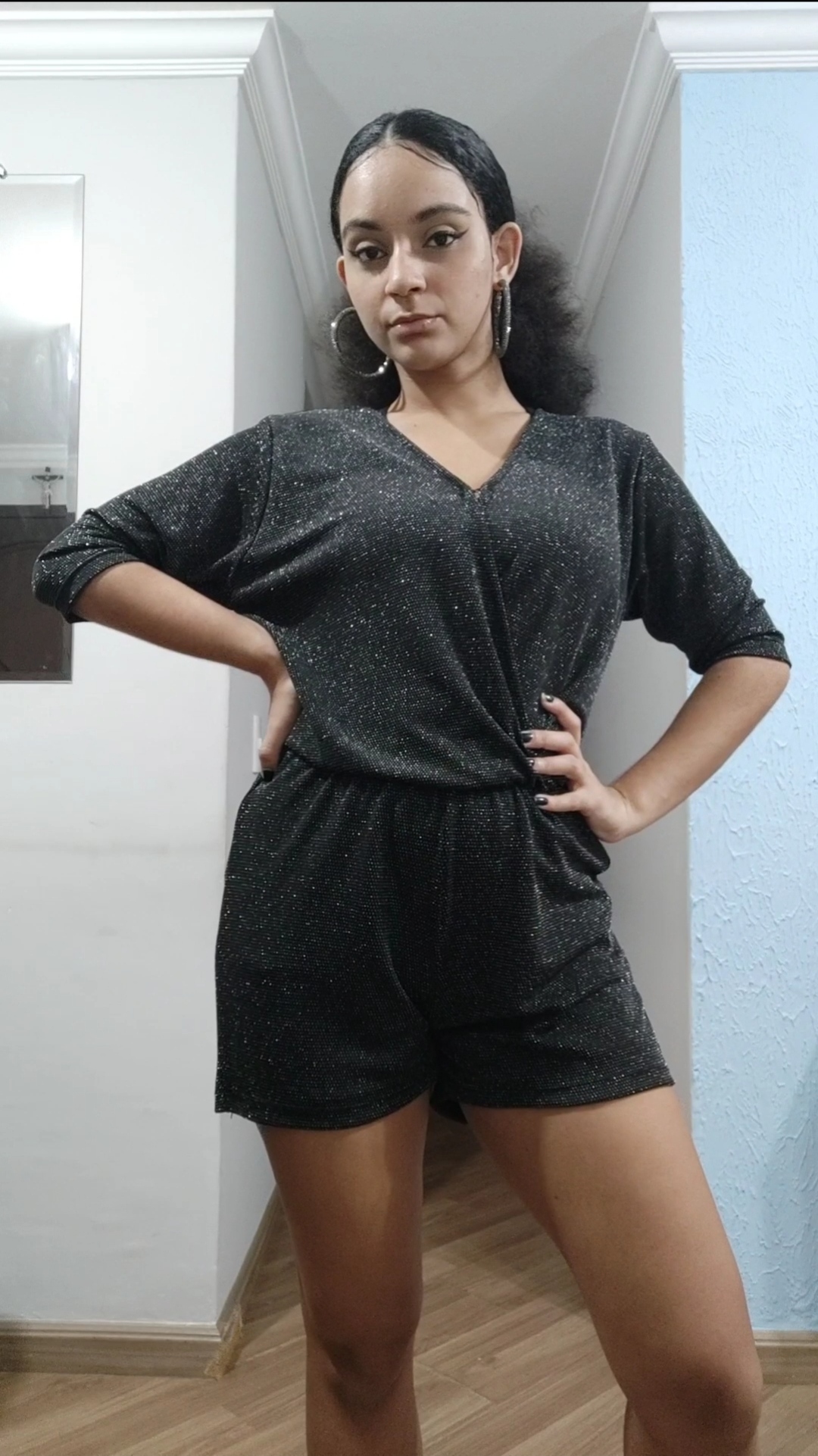 Brincadeiras a parte, eu montei o look mais brilhante que consegui: com meu macacão cheio de brilho, brincos também.