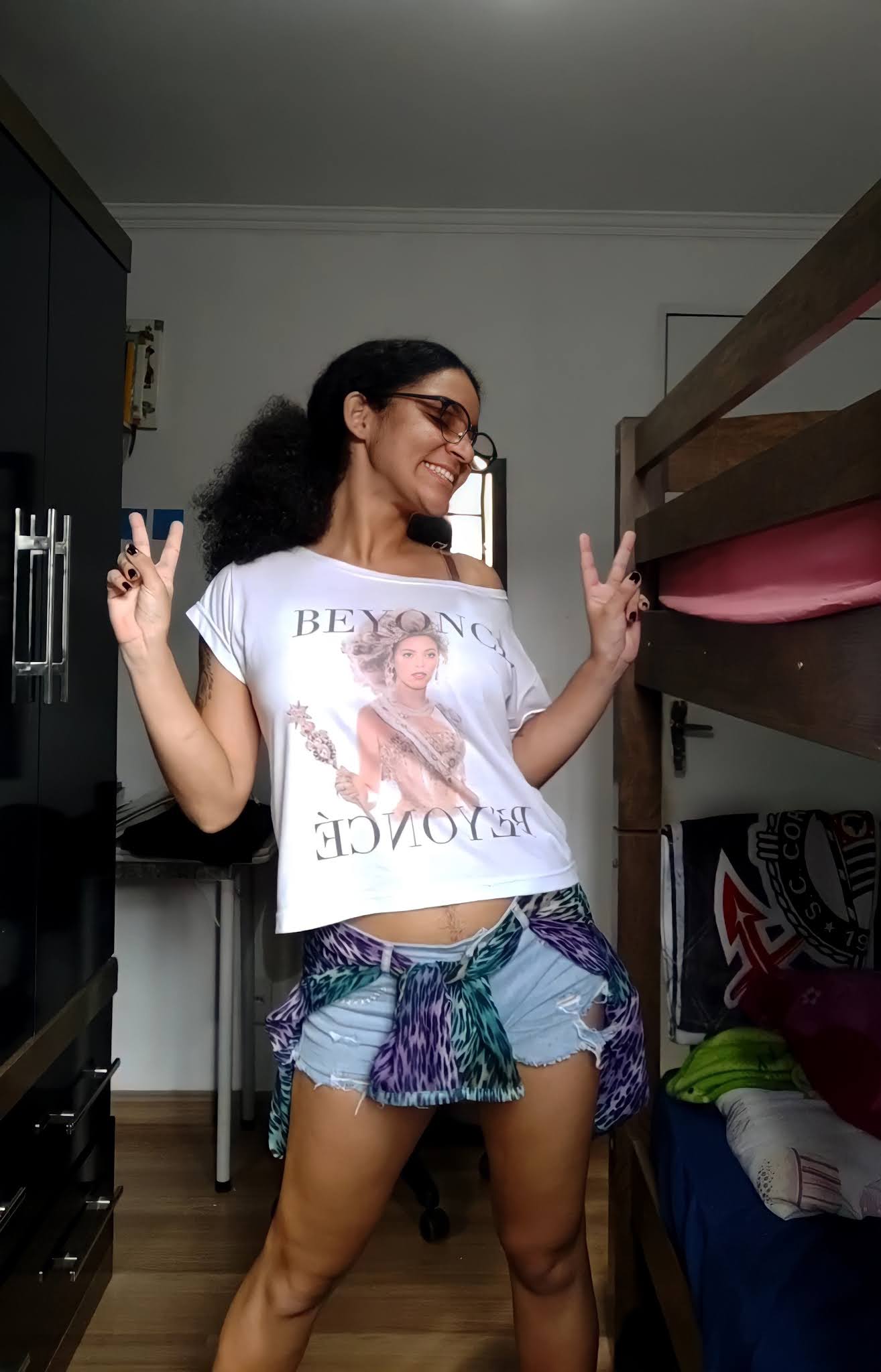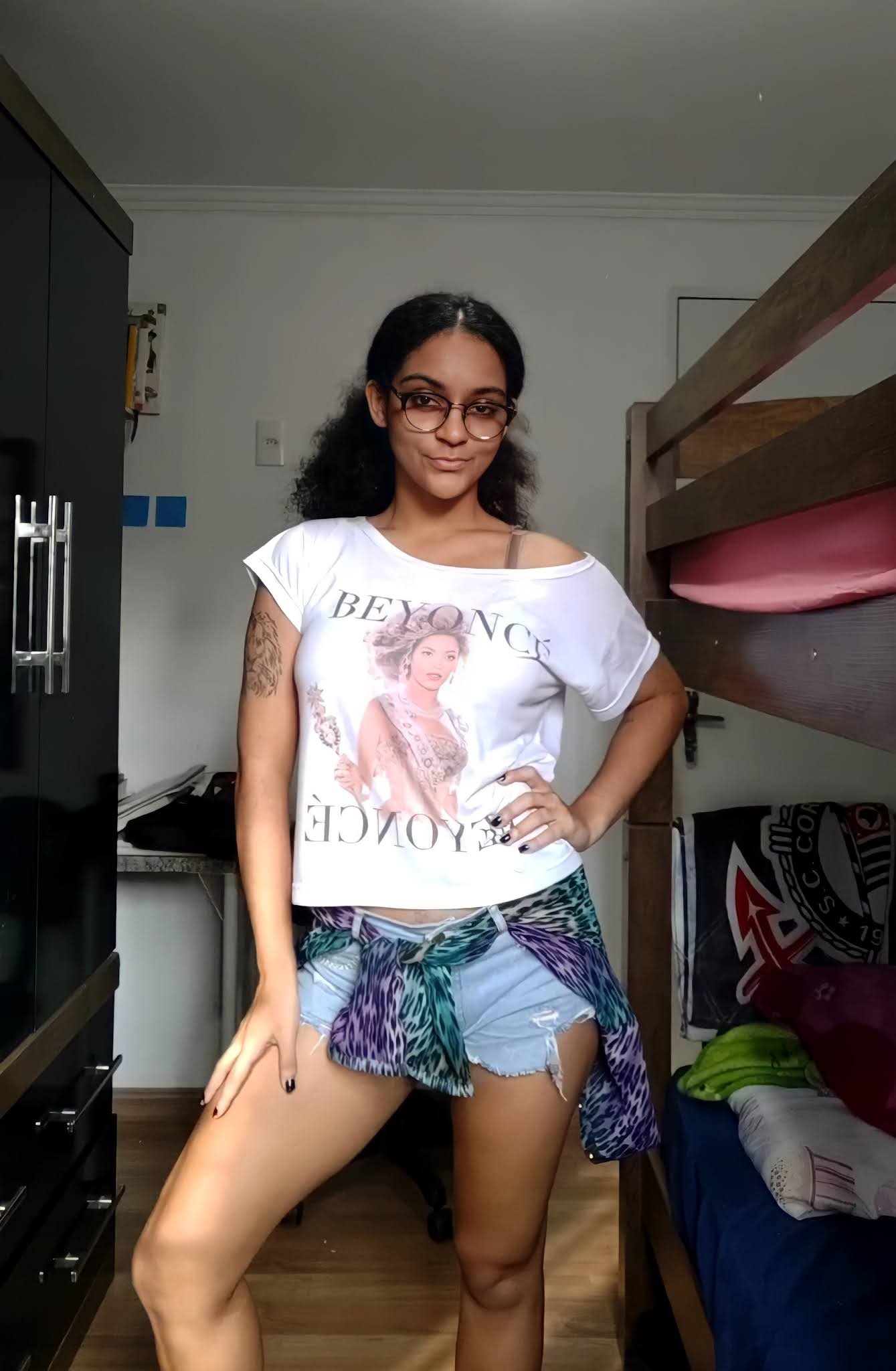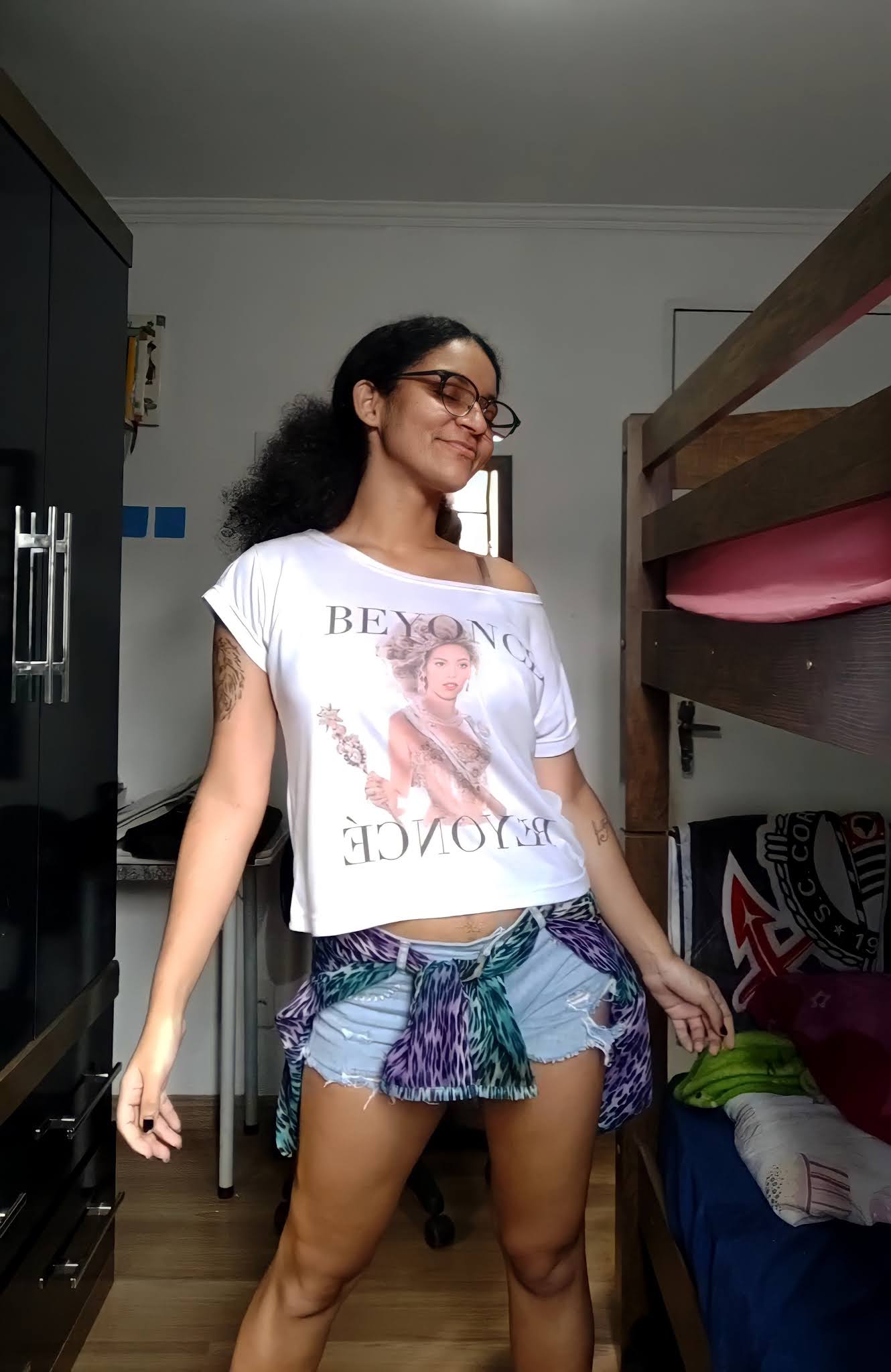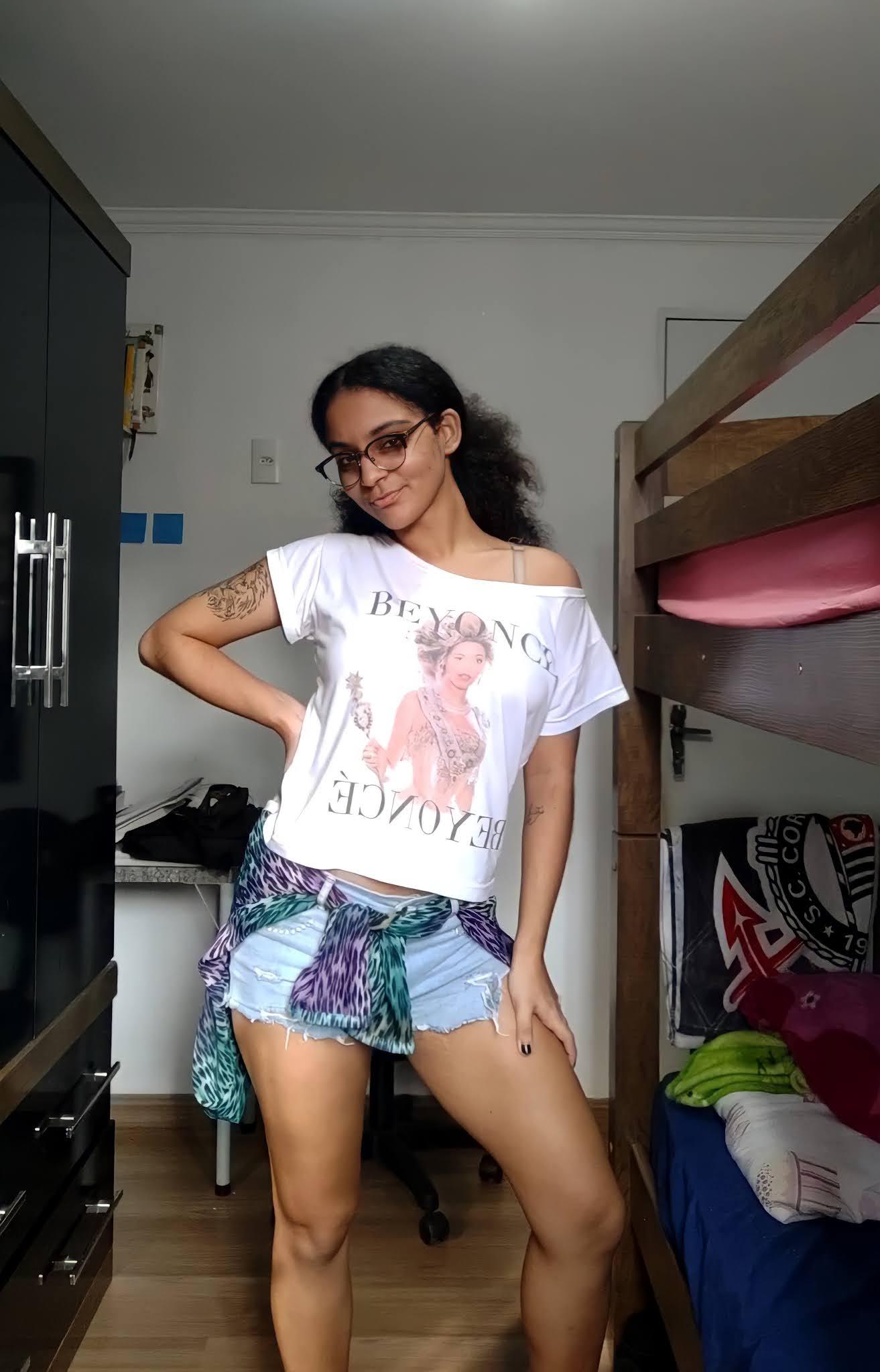 Peguei a única peça com estampa animal que tenho: uma camisa colorida, de tecido transparente, com estampa de onça. Outro detalhe que me atentei, foi o de escolher uma peça de roupa que me remeta a um momento feliz, já que é assim que se conjura um Patronum, então escolhi a camiseta que comprei no dia do show da Beyoncé (o dia mais feliz da minha vida).