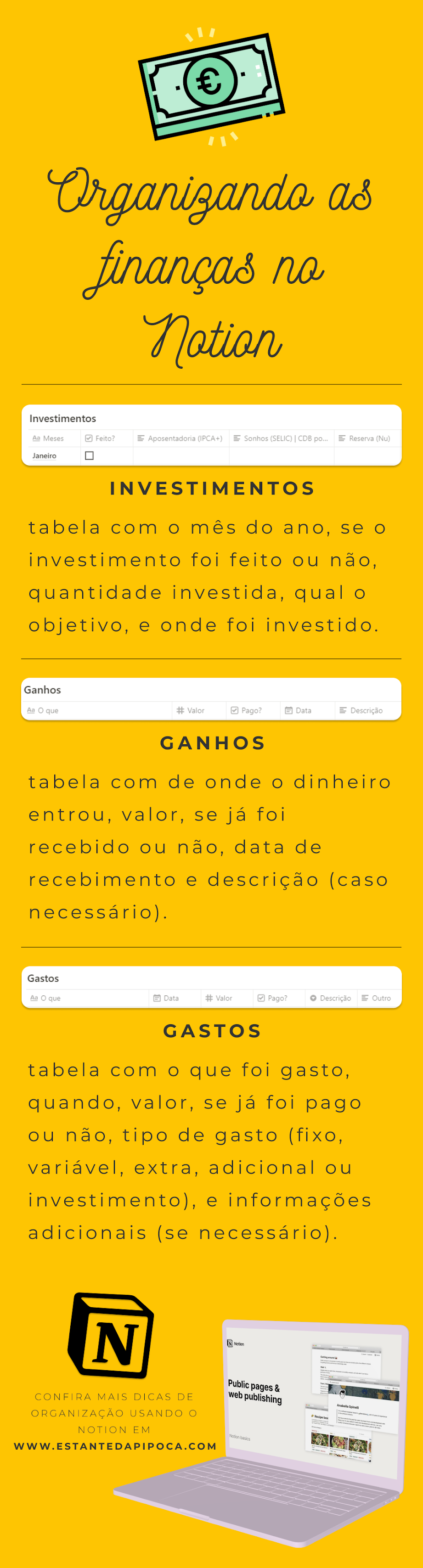 Passei a usar o Notion pra anotar todas as minhas finanças (antes eu usava um caderno mesmo, que antiga, não?), e tenho tudo registrado desde Março desse ano. Anoto tudo o que entra, tudo o que sai, o que vou receber futuramente, meus gastos fixos, variáveis, extras, e etc.