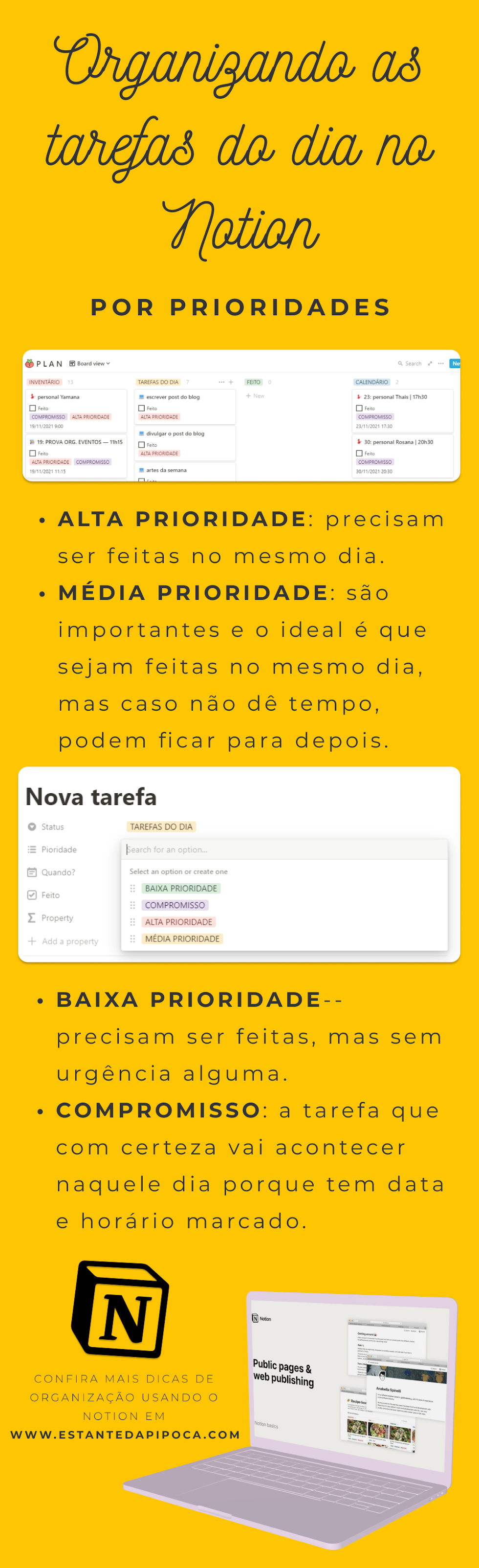 outro post que definir as tarefas do dia e ter horário pra cumprí-las era algo que me deixava super ansiosa, como se eu estivesse correndo contra o tempo, e me frustrava caso eu não conseguisse cumprir tudo, já que deveria, afinal, cada coisa tinha o seu horário. Então, passei a listar minhas tarefas e separá-las por prioridade: alta, média e baixa, o que me ajudou muito.